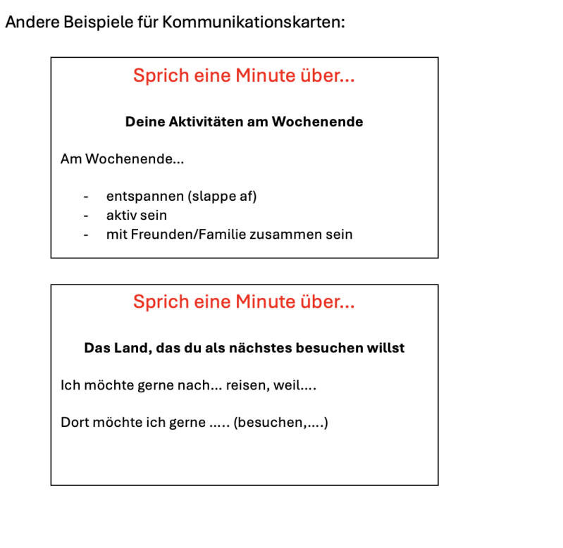 - Sprich eine Minute über…. (Alltagsthemen, Hilfsmittel Redemittel)